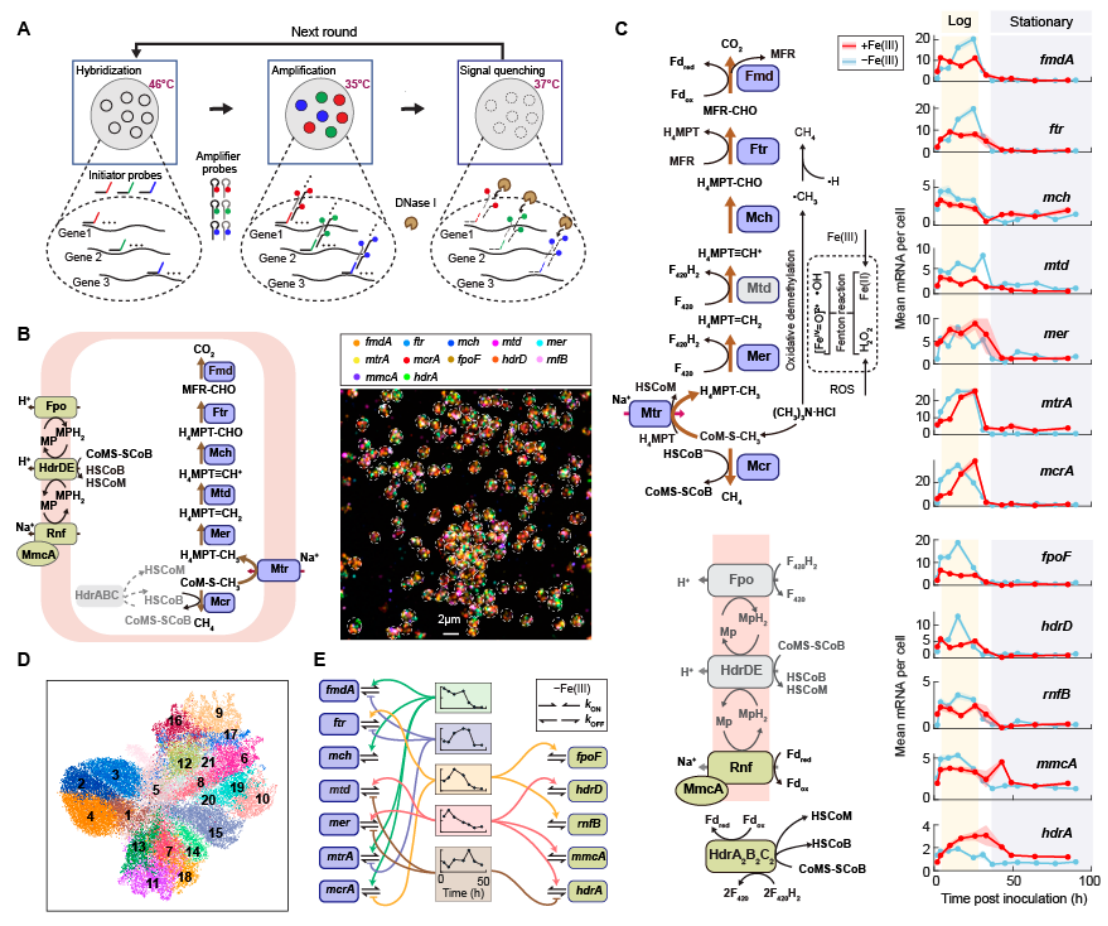 圖1. (A)多輪smHCR-FISH方法示意圖。(B) 產甲烷古菌LMO-1的產甲烷代謝通路以及甲烷代謝關鍵基因的單細胞成像。(C) 產甲烷代謝關鍵基因的表達隨細胞生長時間的變化曲線。(D)通過UMAP可視化展示LMO-1群體中的多個代謝亞群。(E)產甲烷代謝關鍵基因的轉錄調控模式。